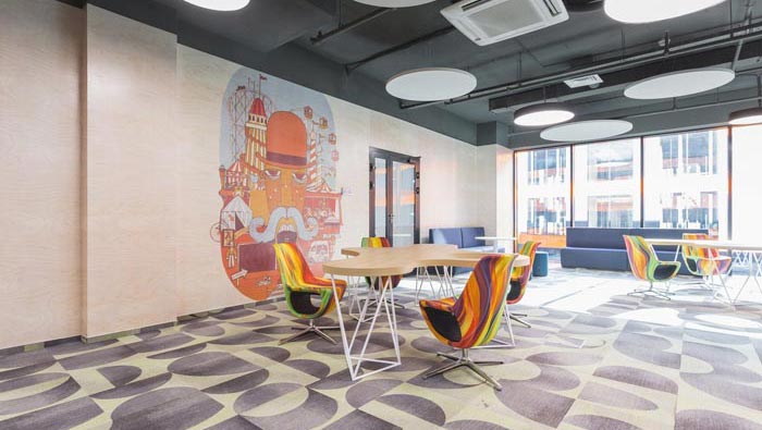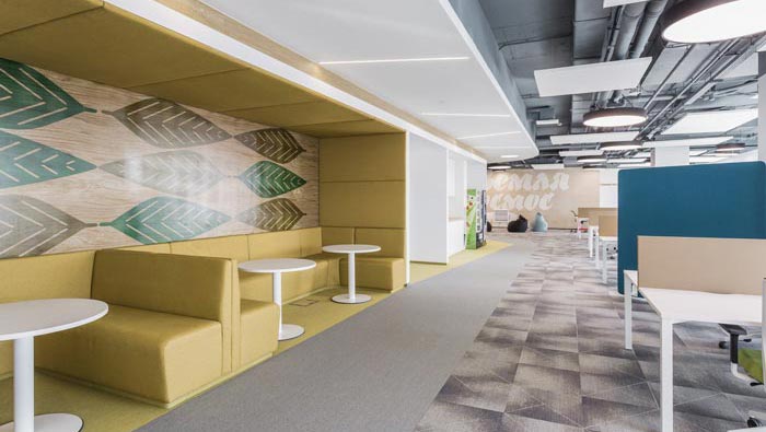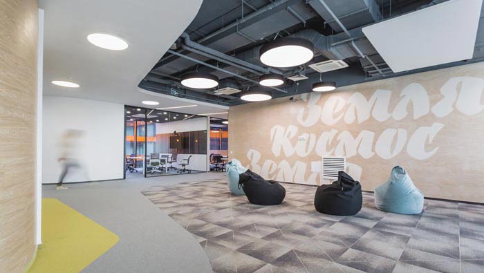 過道結(jié)合部的設(shè)計(jì):此處為整個(gè)企業(yè)的內(nèi)部交匯點(diǎn),在此處過道呈四面八方式分布,不管走哪一個(gè)方向都可以繞回原地,這也是一個(gè)大回型動(dòng)線設(shè)計(jì),故此設(shè)計(jì)師在設(shè)計(jì)中在此地開辟出一片如凈土般的區(qū)域,以軟裝進(jìn)行鋪墊,讓員工、客戶在此處可以休息、娛樂,可增可減的沙包型座椅,也在無形中成為一處亮點(diǎn)。