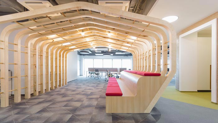 休息區(qū)域的設(shè)計(jì):設(shè)計(jì)師在設(shè)計(jì)的時(shí)候,采用了三位一體的設(shè)計(jì)手法,融合了過道、造型與休息區(qū)域,將一個(gè)過道空間改為空間的一處亮點(diǎn),上下兩層休息區(qū)域增加了容納能力,也增加了空間的流線造型,設(shè)計(jì)師希望為企業(yè)的每一處空間都留下一處讓人眼前一亮的設(shè)計(jì)。