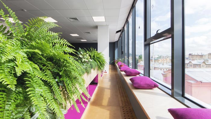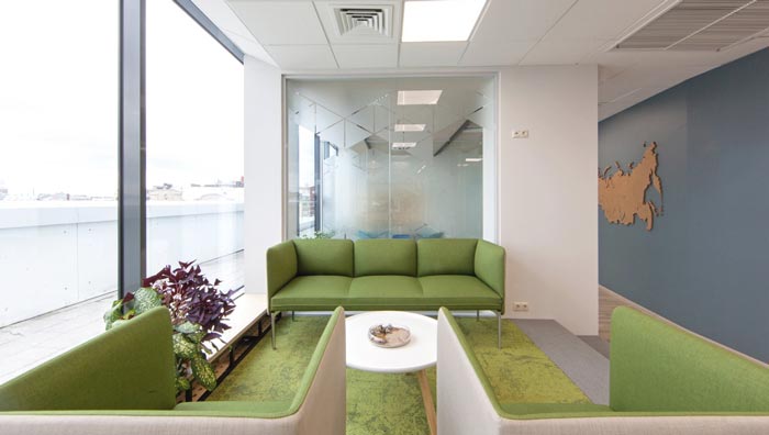 進門區域的設計:客戶進入后看到的一處生機勃勃的空間,這也這是設計師特意為之,在設計師看來不管是什么,第一印象都十分重要,故此設計師希望通過生機勃勃的進門區域,給客戶留下一個不錯的第一印象,同時生機勃勃也在一定程度上展示企業蓬勃發展的前景。
