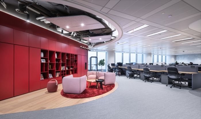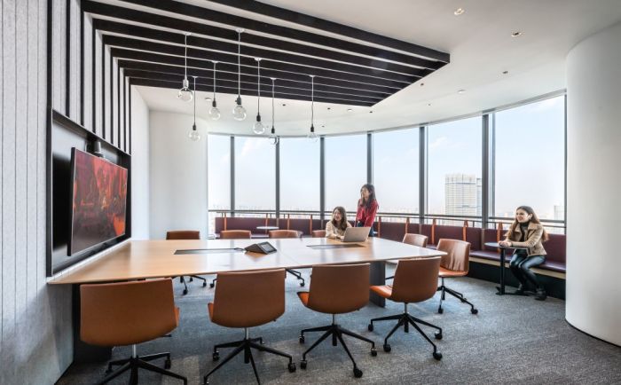 辦公室采用多種類型和形式的燈光,包括地面、吊燈和桌面燈光,以呈現(xiàn)明亮、充滿活力的工作文化。辦公室還運(yùn)用了中國傳統(tǒng)文化元素,如靈感來源于中國古代故事的地面和家具設(shè)計(jì),以及以中國農(nóng)歷年為靈感的室內(nèi)裝飾。 辦公室還強(qiáng)調(diào)了與本地社區(qū)的聯(lián)系,通過標(biāo)志、裝飾和環(huán)境藝術(shù)作品等方式運(yùn)用了中國傳統(tǒng)文化的符號(hào)、顏色和字體。此外,辦公室還注重環(huán)境友好和員工福利,包括提供全景視野的餐廳和社交區(qū)域,以及可調(diào)節(jié)高度的辦公桌。