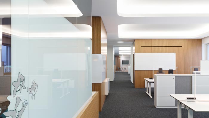 辦公區域的設計:設計師在設計的時候,在采用開放式辦公的同時,以儲存柜代替隔斷將每一個辦公工位進行隔離,在設計師看來這樣的設計可以有效的彌補開放式的缺點,同時讓空間看起來更加有層次感,儲藏柜的設置也很好的解決了空間容納的缺憾,真是一舉兩得。