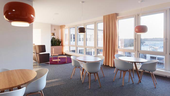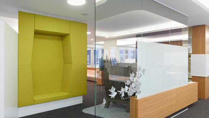 休息區域的設計:設計師在設計的時候,將此處設置在向陽的空間之中,在設計師看來陽光是人類無法拒絕的誘惑,暖洋洋的陽光透過落地窗射入室內,為空間帶來了光明與溫暖,設計師希望讓員工在這樣的空間之中,可以放松自身,在暖洋洋的空間中尋找自我而。