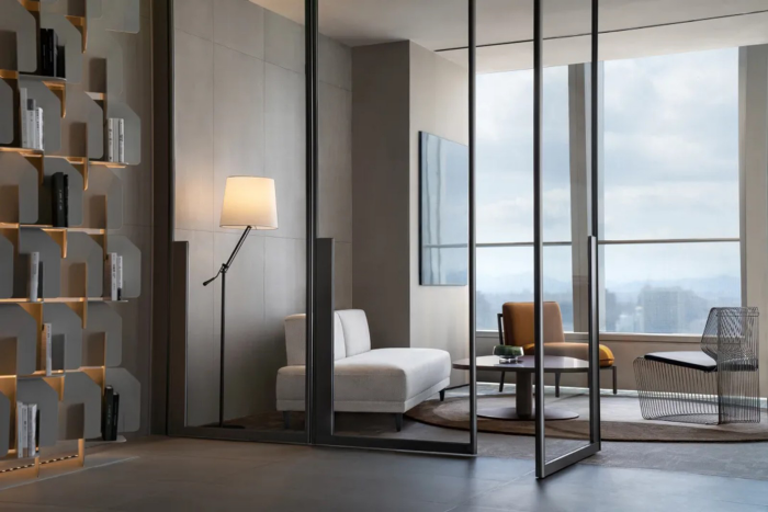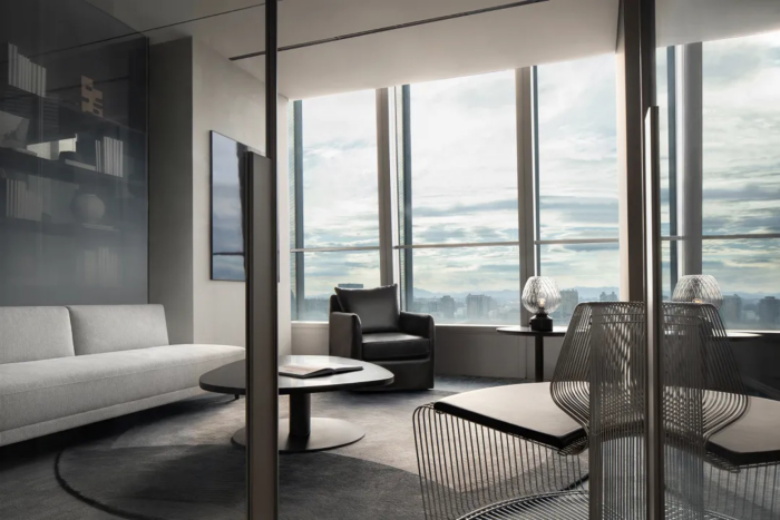 走廊承擔(dān)休息與公司分享的場(chǎng)所,活動(dòng)的多重舉辦賦予其多重身份,以體塊成為空間審美品質(zhì)的鋪墊。多重的東方元素,在體塊空間的對(duì)稱與縱深中, 成為銜接?xùn)|方美學(xué)與現(xiàn)代質(zhì)感的橋梁。