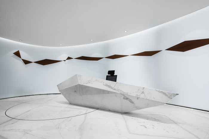 設計師在設計辦公空間時,不僅要考慮使用、功能、視覺、風格和儲物等方面,還需要考慮人與人之間的溝通便捷和高效的管理。設計師運用了影視的膠片形式和蒙太奇的片段組合,將空間打造成一個包容接納創(chuàng)新的地方。金屬制作的明確醒目標識體現(xiàn)了堅實的基礎和輕盈的手法。