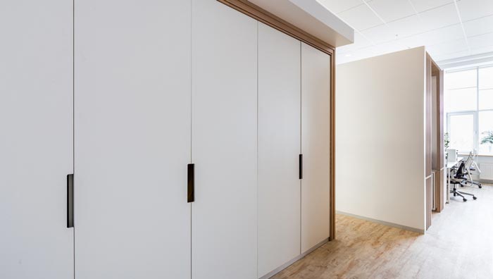 工具間的設計:設計師舍棄了一個工位,將其打造成工具間,這樣設計的好處就是在不影響格局的前提下,將每一個區域都安排的恰如其分,同時此處也位于空間的中央,在無形上提升了工作的效率,設計師需要做的就是在滿足需求的同時,并逐漸優化、細化設計。