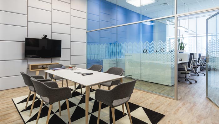 會議室的設計:此次位于辦公區域的一邊,這樣設計也是受到空間面積的限制,在玻璃隔斷上設計師采用了隔音玻璃,目的就是為了保證會議的正常運行,空間布局簡單、便捷,讓員工在這樣的空間中可以自由發揮,在設計師看來會議的開展正該如此。