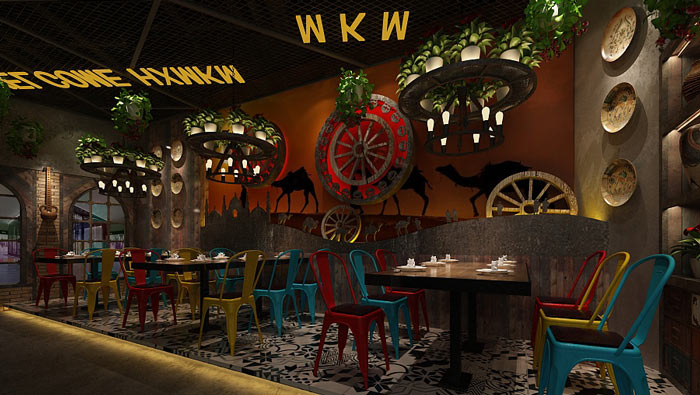 本次為特色主題餐廳裝修設計方案,餐廳的老板鐘情于西域風情,故此在考察過新疆之后,就決定打造新疆風情的主題餐廳,設計師在設計中以工業風格為主基調,搭配新疆元素,目的就是為了將其融合在整個空間設計之中,設計師要做的就是讓空間活起來,讓一切變的自然。