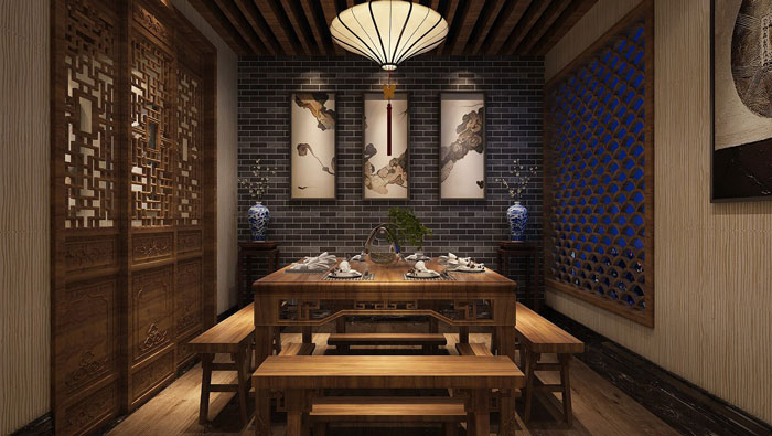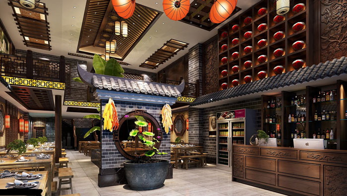 中式川菜館大廳裝修設計:大廳給人的感覺好似回到過去,但是又稍有不同,設計師在中式設計的同時,也加入了很多現(xiàn)代元素,目的就是希望營造一個古代、現(xiàn)代融合的空間。