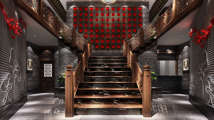 中式川菜館樓梯裝修設計:一分為二的木制樓梯,相信現(xiàn)在很少見到,這樣的樓梯一來是為了更好的分流,二來是起到連接空間的作用,客戶在這里感受到濃郁的古式風格。