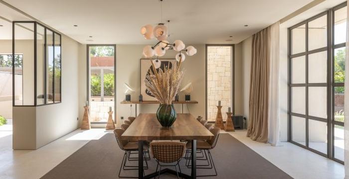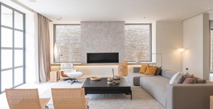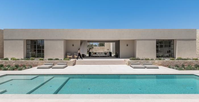 一間現代簡約別墅裝修設計案例,空間面積600平方米。它有4間臥室和4間浴室,一間餐廳,一間電視房,一間接待室,一間廚房,一間辦公室。