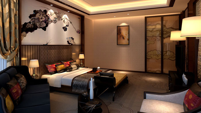 設(shè)計(jì)理念:室內(nèi)設(shè)計(jì)中,設(shè)計(jì)師將古典的壁畫(huà)與現(xiàn)代的吊燈與低垂的竹簾處處協(xié)調(diào),將濃重的顏色宣泄到底,張揚(yáng)到極致,其結(jié)果反而出奇的和諧,紅和金的富麗感無(wú)可匹敵,也讓人盡情沉醉于中國(guó)風(fēng)的視覺(jué)盛宴中。