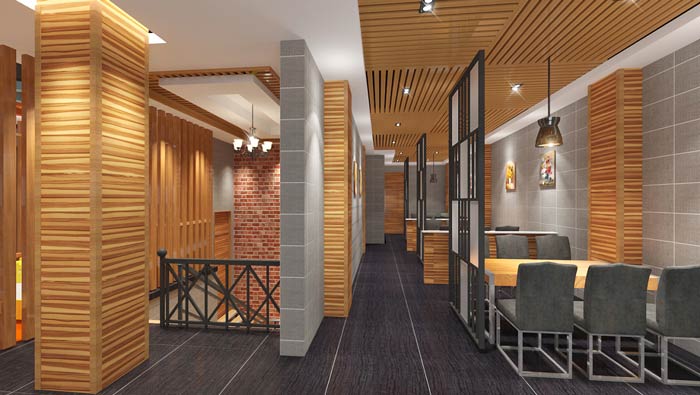 本次為魚火鍋店裝修設計方案,在實地考察的時候,了解到整個空間是兩層建筑,在設計中一樓主要由前臺、開放式就餐區(qū)構成,二樓主要由包間、以及兒童玩耍區(qū)構成,空間地面采用黑色仿古磚,墻面采用三種色彩的材質(zhì)與小紅磚,讓客戶仿佛在記憶中中老房子里就餐。