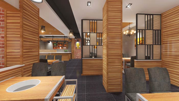 本次魚火鍋店裝修設計方案講解到此結束,設計師在本次火鍋店設計中,空間地面采用黑色仿古磚,墻面采用三種色彩的材質(zhì)與小紅磚,讓客戶仿佛在記憶中中老房子里就餐。