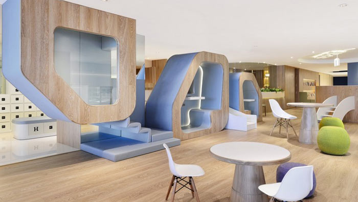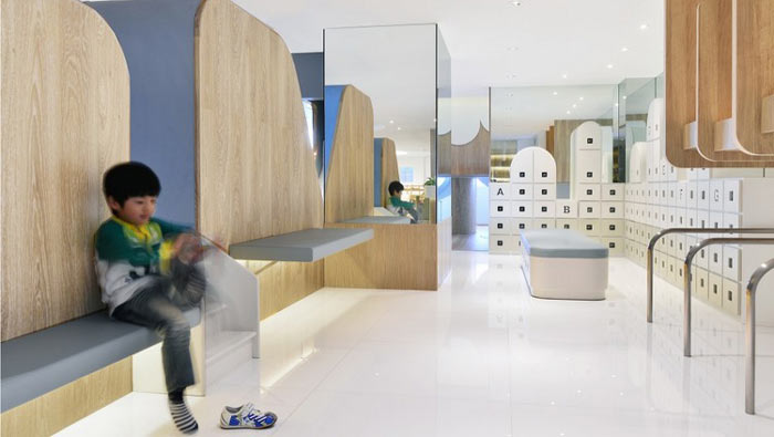 兒童教育培訓(xùn)機(jī)構(gòu)接待區(qū)設(shè)計:說是接待區(qū)其實(shí)也兼顧洽談與休閑,在設(shè)計中設(shè)計師在同一個空間內(nèi),設(shè)計并放置了兩套家具系統(tǒng),目的就是滿足兒童和成人各自的需求。