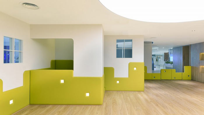 兒童教育培訓(xùn)機(jī)構(gòu)防磕碰設(shè)計:在孩子們可以夠得到的地方,設(shè)計師都加入了防磕碰海綿,目的就是希望給孩子一個安全、放松的空間,讓孩子們玩的開心、玩的放心。