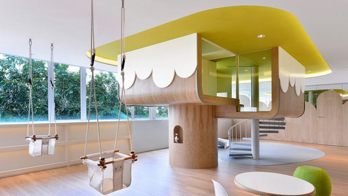 兒童教育培訓(xùn)機(jī)構(gòu)秋千區(qū)設(shè)計:探索樹上小木屋,讓孩子體驗(yàn)像鳥一樣的自由自在,每天蕩秋千20分鐘,寶寶會快樂一整天,來源于戶外的靈感,營造舒適的室內(nèi)玩耍空間。