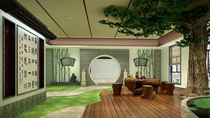 書法教育培訓機構庭院設計:菩提本無樹,明鏡亦非臺,本來無一物,何處惹塵埃,四局偈語表現的即是書法也是道理,表示書法的博大精深。