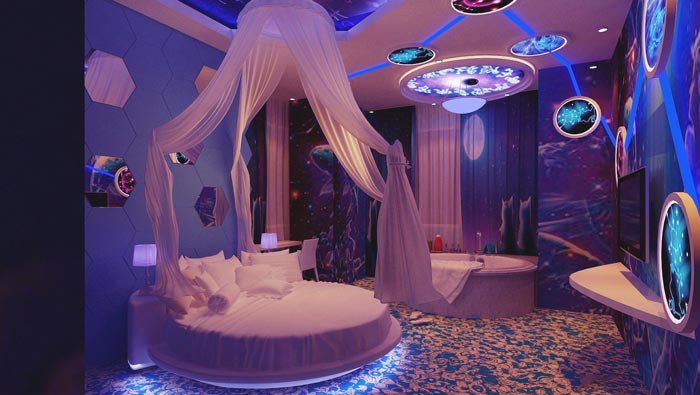 星座客房的設計:對于星座相信很多戀人都是趨之若鶩的,設計師根據這個現象就像打造一個星座客房,讓戀人之間感受一下星座世界,在這里一切都是那么的夢幻,讓我們仿佛漂浮在空間一樣,在這里時間仿佛靜止了一般,在這里戀人們互相尋找著彼此的星座,相互依偎著。