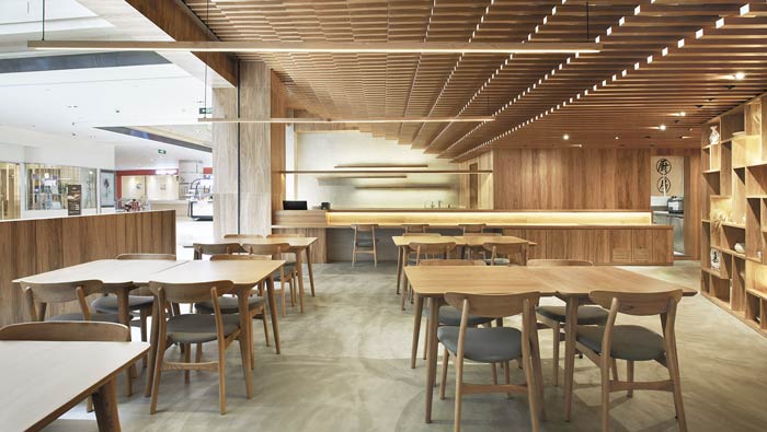 日式餐廳餐區設計:從側角看整個空間呈不規則分布,客戶在就餐區可以清晰的看到每一個區域,這樣設計是為了讓客戶吃的放心、吃的安心。