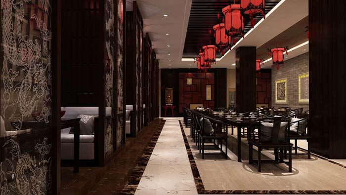 中餐廳餐區燈光設計:常見的燈光被燈籠所代替,燈籠正掛于餐桌的上方,之所以這樣安置,是因為燈籠的光是柔和的,不會刺激客戶的眼睛,在這里就餐給人不一樣的感受。