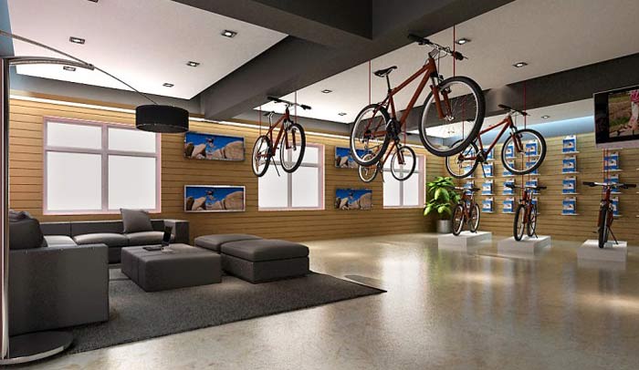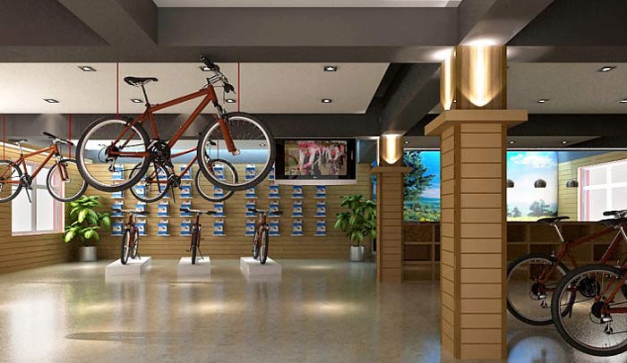 設計理念:設計師按照自行車專賣店的標準來設計,業主對奧城自行車店裝修設計的要求設計是風格大氣、簡潔、體現品牌形象。同時設計師參考同行業和根據行業特性自由發揮,主要涉及門頭、背景墻,前臺與展示架、整體的風格搭配。自行車展示。整體需要有品牌氣氛。